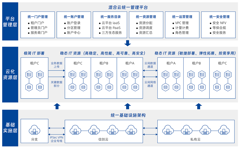 面向已部署多云、信創(chuàng)基礎設施的行業(yè)用戶,提供自助化、自動化的云服務快速交付服務。管理企業(yè)內部多個數據中心的物理、虛擬資源,以及容器、私有云、公有云資源,并對以上資源進行混合編排,提供基礎軟件和應用軟件的自動化部署服務,以及云資源的全生命周期管理。