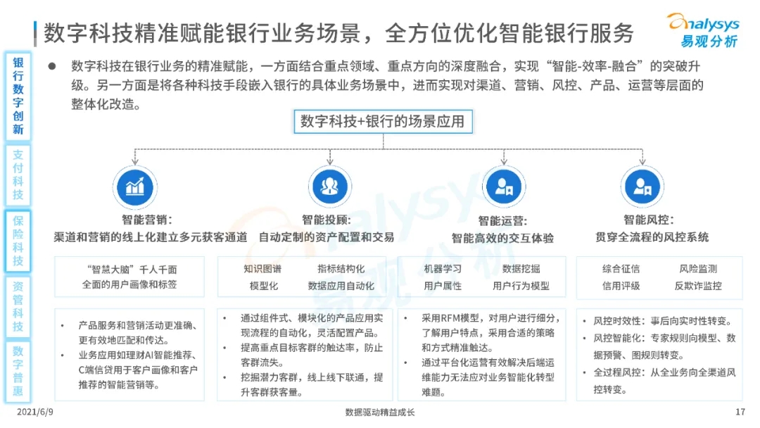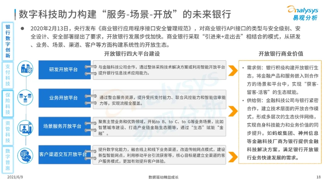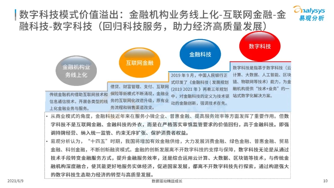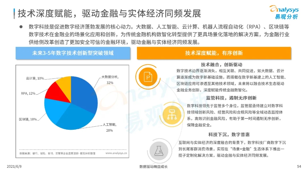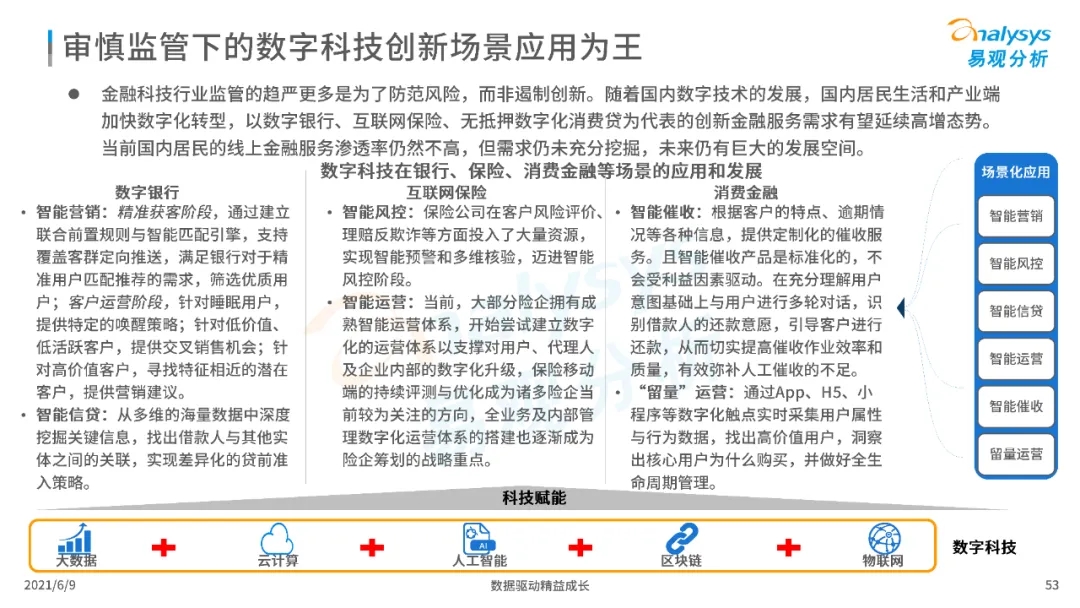 以大數(shù)據(jù)、人工智能、物聯(lián)網(wǎng)、區(qū)塊鏈等為代表的數(shù)字科技驅(qū)動金融產(chǎn)業(yè)數(shù)字化方興未艾,數(shù)字科技使得金融和科技兩個(gè)領(lǐng)域產(chǎn)生更緊密的場景聯(lián)結(jié),使得數(shù)字科技服務(wù)可以更早、更有效地介入到金融產(chǎn)業(yè)增長模型中去,更早的融入到企業(yè)和個(gè)人的資產(chǎn)生成過程,并從根本上提升金融機(jī)構(gòu)資產(chǎn)透視能力和資產(chǎn)定價(jià)能力,幫助金融機(jī)構(gòu)和實(shí)體部門降低成本、提升效率、增強(qiáng)用戶體驗(yàn)及優(yōu)化業(yè)務(wù)模式。