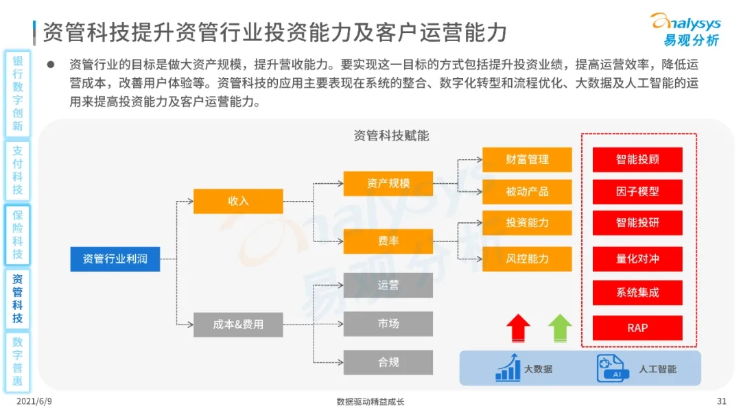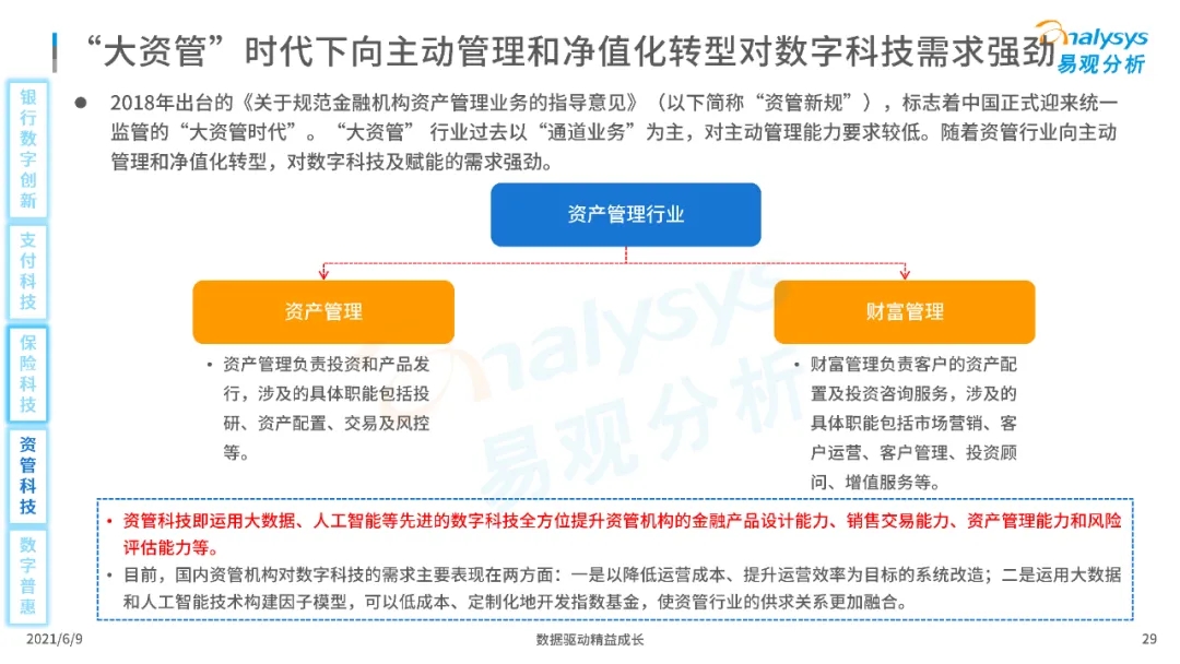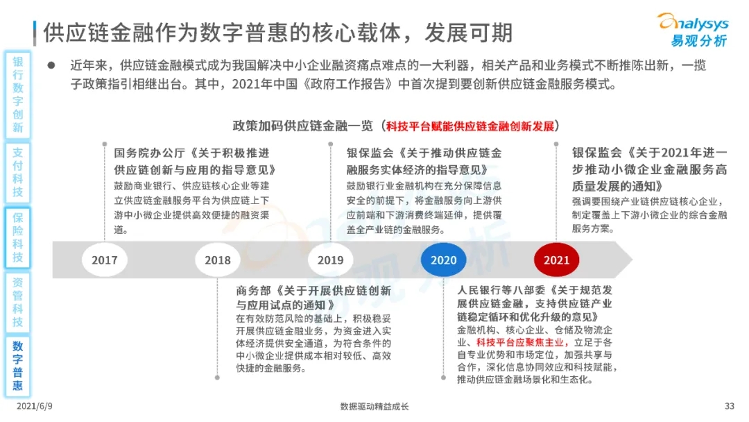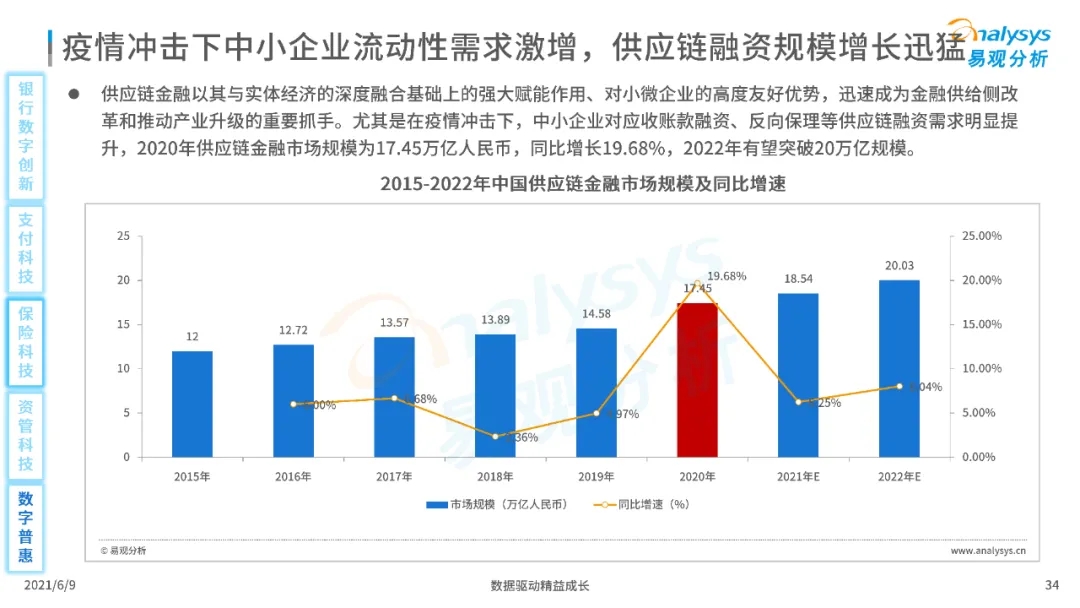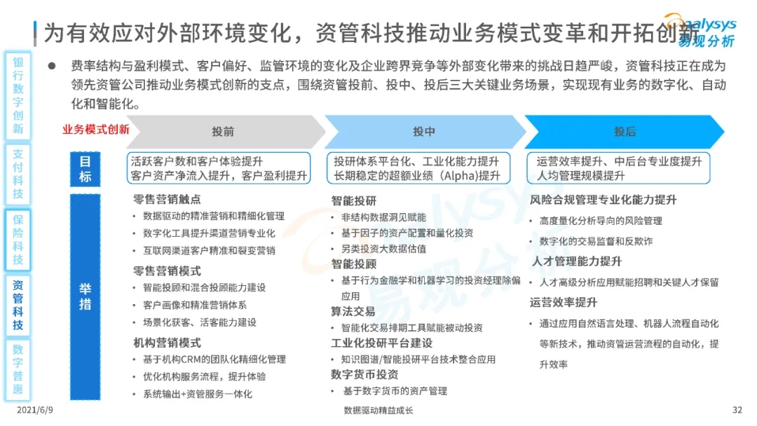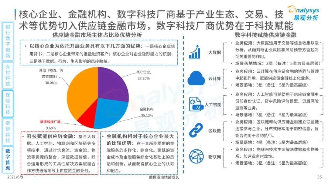 以大數(shù)據(jù)、人工智能、物聯(lián)網(wǎng)、區(qū)塊鏈等為代表的數(shù)字科技驅(qū)動金融產(chǎn)業(yè)數(shù)字化方興未艾,數(shù)字科技使得金融和科技兩個(gè)領(lǐng)域產(chǎn)生更緊密的場景聯(lián)結(jié),使得數(shù)字科技服務(wù)可以更早、更有效地介入到金融產(chǎn)業(yè)增長模型中去,更早的融入到企業(yè)和個(gè)人的資產(chǎn)生成過程,并從根本上提升金融機(jī)構(gòu)資產(chǎn)透視能力和資產(chǎn)定價(jià)能力,幫助金融機(jī)構(gòu)和實(shí)體部門降低成本、提升效率、增強(qiáng)用戶體驗(yàn)及優(yōu)化業(yè)務(wù)模式。