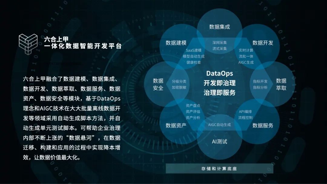 最后,黃萬忠聊到數(shù)據(jù)資產(chǎn)價(jià)值變現(xiàn)的方法,也著重推薦了神州信息在數(shù)據(jù)資產(chǎn)價(jià)值發(fā)揮方面的成功經(jīng)驗(yàn)。神州信息根據(jù)實(shí)戰(zhàn)經(jīng)驗(yàn),開發(fā)了一款名叫“六合上甲”的一體化數(shù)據(jù)資產(chǎn)管理和服務(wù)平臺(tái)。它融合了數(shù)據(jù)建模、數(shù)據(jù)集成、數(shù)據(jù)開發(fā)、數(shù)據(jù)萃取、數(shù)據(jù)服務(wù)、數(shù)據(jù)資產(chǎn)、數(shù)據(jù)安全等模塊,基于DataOps理念和AIGC技術(shù)在大大批量離線數(shù)據(jù)開發(fā)等領(lǐng)域采用自動(dòng)生成腳本方法,并自動(dòng)生成單元測試腳本。可幫助企業(yè)治理內(nèi)部不斷上漲的“數(shù)據(jù)懸河”,在數(shù)據(jù)遷移、構(gòu)建和應(yīng)用的過程中實(shí)現(xiàn)降本增效,讓數(shù)據(jù)價(jià)值最大化。
