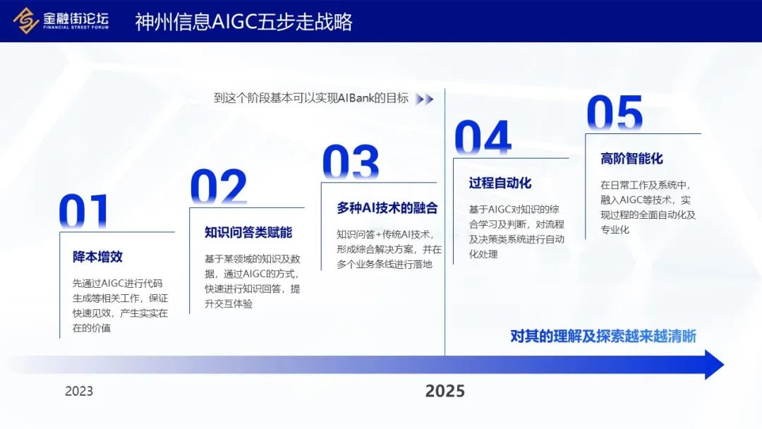 薛春雨介紹了神州信息AIGC五步走戰略,通過AIGC降本增效、知識問答類賦能和多種AI技術在業務場景中的融合,基本實現AIBank的戰略目標;后續將持續往過程的自動化和高階智能化發展,以推動金融行業的全面智能化。