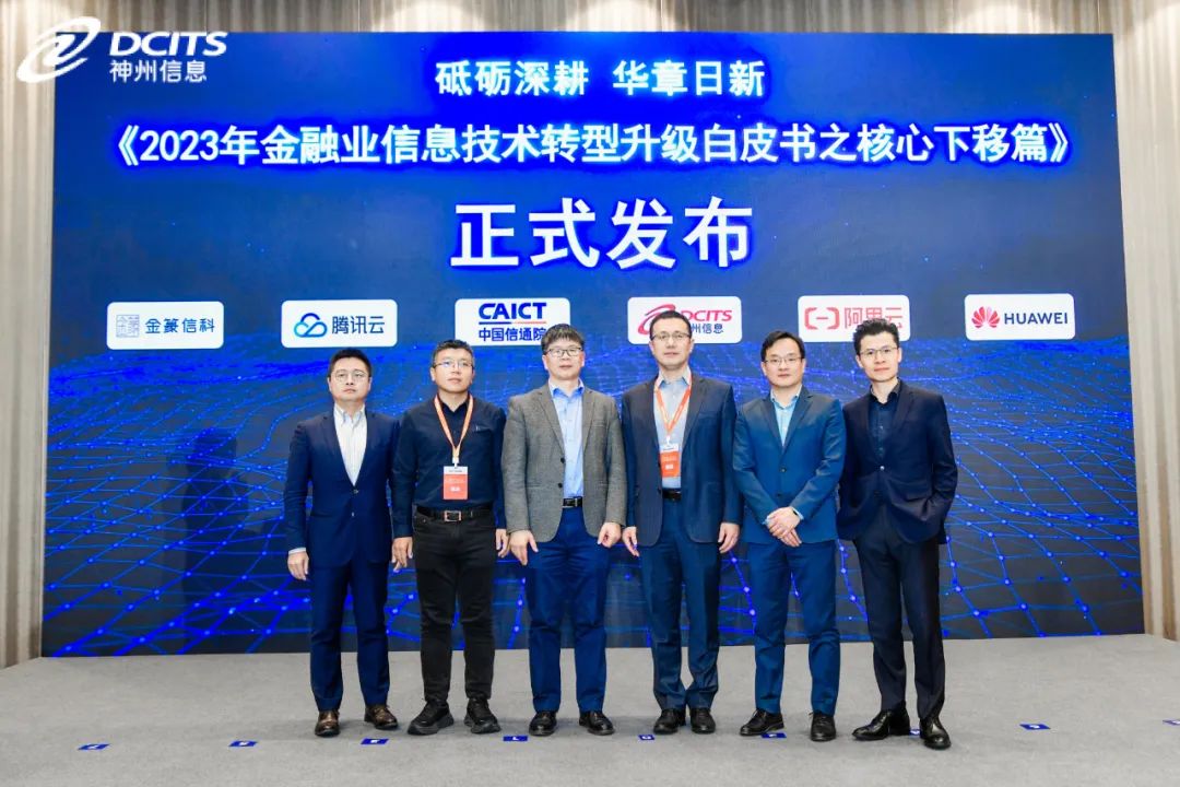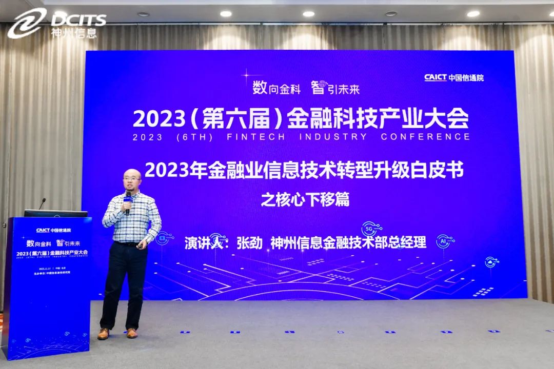 在本次大會上, 神州信息聯(lián)合中國信通院、阿里云、騰訊云、華為、金篆信科等單位共同發(fā)布了《砥礪深耕,華章日新—2023年金融業(yè)信息技術(shù)轉(zhuǎn)型升級白皮書之核心下移篇》(以下簡稱“白皮書”),神州信息副總裁馬洪杰(上圖右三)、中國信通院副總工程師石友康(上圖左三)、阿里云新金融事業(yè)部副總經(jīng)理 宋勇(上圖右二)、騰訊金融云副總經(jīng)理王豐輝(上圖左二)、華為數(shù)字金融軍團(tuán)分布式新核心業(yè)務(wù)總經(jīng)理韓滿(上圖右一)、金篆信科副總經(jīng)理張校逸(上圖左一)等嘉賓共同出席發(fā)布儀式,神州信息金融技術(shù)部總經(jīng)理張勁(下圖)作為代表對白皮書進(jìn)行了解讀。
