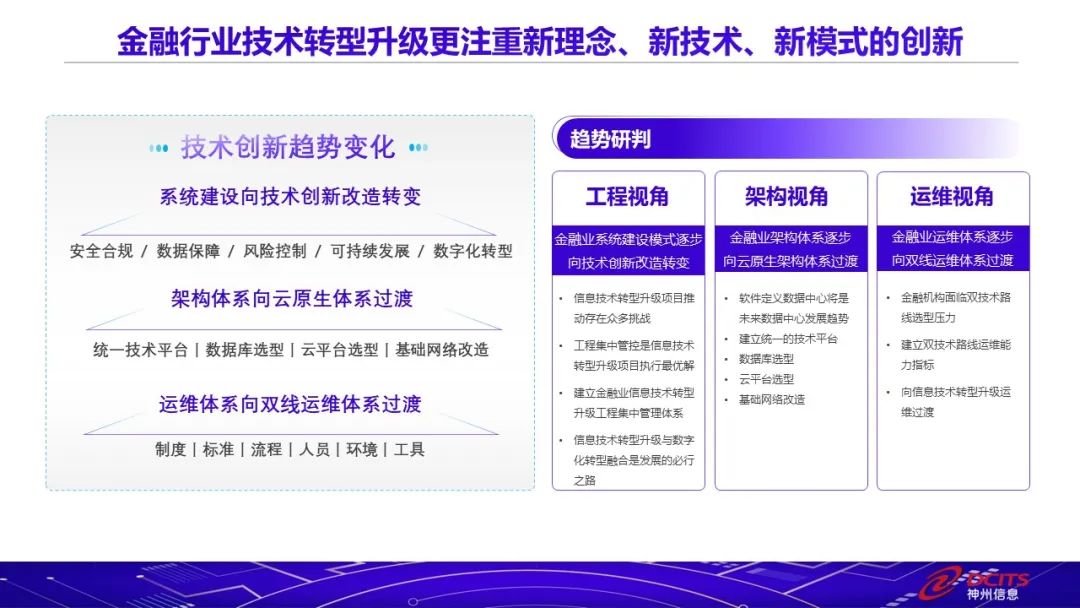 張勁表示,隨著數(shù)字化轉(zhuǎn)型及信息技術(shù)轉(zhuǎn)型升級成為行業(yè)共識,監(jiān)管側(cè)全面構(gòu)筑技術(shù)創(chuàng)新能力要求,產(chǎn)業(yè)側(cè)進(jìn)行著以市場為導(dǎo)向的轉(zhuǎn)變和機(jī)構(gòu)與廠商雙向選擇的變化,技術(shù)側(cè)也呈現(xiàn)出云替換、一云多芯、持續(xù)演進(jìn)、開放生態(tài)、安全合規(guī)多個發(fā)展趨勢,白皮書對金融行業(yè)技術(shù)創(chuàng)新趨勢進(jìn)行了研判,從工程視角,金融業(yè)系統(tǒng)建設(shè)模式逐步向技術(shù)創(chuàng)新改造轉(zhuǎn)變;從架構(gòu)視角,金融業(yè)架構(gòu)體系逐步向云原生架構(gòu)系統(tǒng)過度;從運(yùn)維視角,金融業(yè)運(yùn)維體系逐步向雙線運(yùn)維體系過渡。