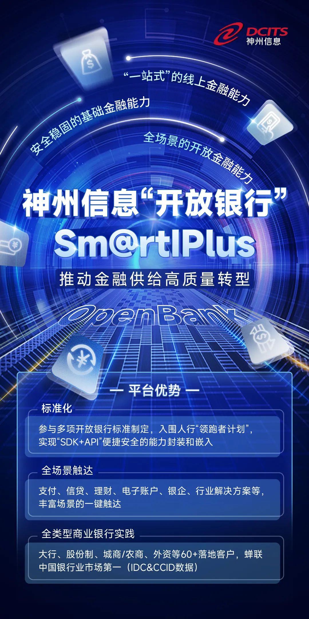 神州信息作為國內最早推動“開放銀行”理念落地的公司,通過研發互聯網開放平臺Sm@rtIPlus等系列產品,圍繞“開放、共享、共建”的Open Bank理念形成了完善的產品和服務能力。神州信息從最早參與國有大行、全國性股份制銀行項目建設,再到如今結合區域銀行的現實需求,從“服務能力、集成開發能力、安全能力、治理能力、運營能力”等多方面,幫助區域銀行打造具有差異化特色的Open Bank能力體系,更好的結合區域特點,實現金融供給能力和產品的創新改善。