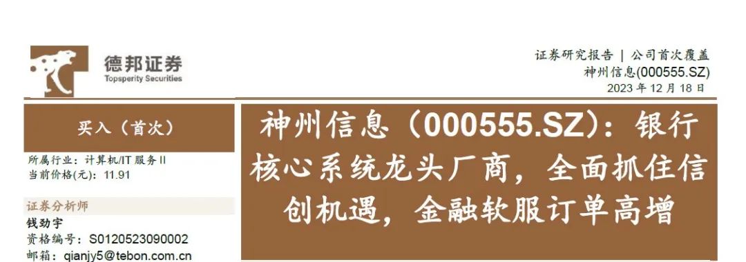 12月18日,德邦證券發表了名為《神州信息(000555.SZ):銀行核心系統龍頭廠商,全面抓住信創機遇,金融軟服訂單高增》的最新研報,給予“買入”評級。以下為內容概覽: