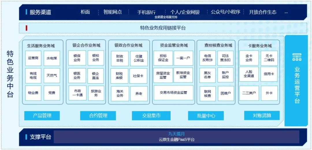 銀行不僅是經(jīng)濟(jì)發(fā)展的助推器,更是經(jīng)濟(jì)生態(tài)場(chǎng)景中不可或缺的鏈接居間機(jī)構(gòu)。近期,來(lái)越來(lái)越多的銀行啟動(dòng)特色中間業(yè)務(wù)中臺(tái)項(xiàng)目建設(shè)。神州信息特色業(yè)務(wù)中臺(tái)產(chǎn)品,以行業(yè)首個(gè)金融云原生技術(shù)平臺(tái)“九天攬?jiān)?rdquo;為基礎(chǔ)支撐平臺(tái),從技術(shù)架構(gòu)和業(yè)務(wù)創(chuàng)新兩方面,為銀行特色業(yè)務(wù)發(fā)展提供全方位的支撐。