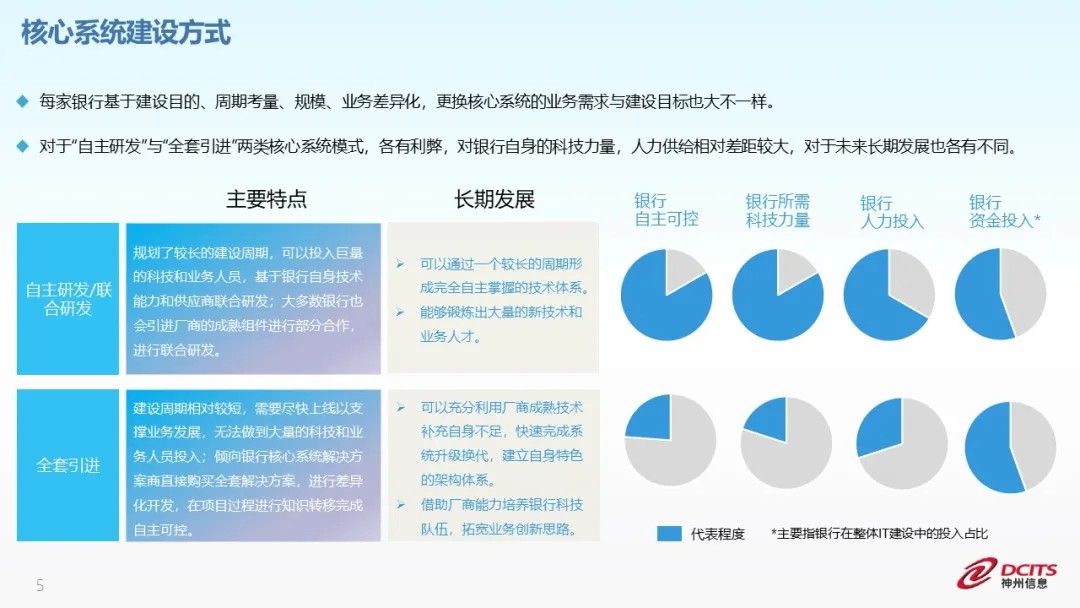 作為銀行最重要的生產系統,核心系統一直是銀行IT建設的重中之重,投入大、涉及部門多、建設周期長,其建設不僅是對全行科技能力的一次迭代,更是對全行科技能力的一次大考。目前國內核心建設主要采用“自主和聯合”兩種方式。
