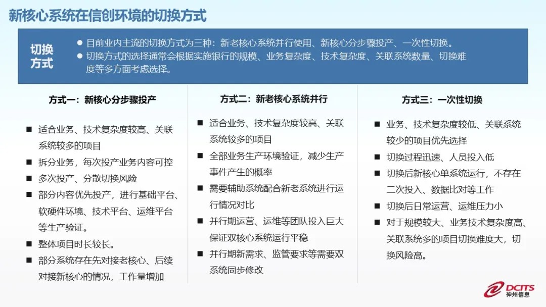 一是信創環境下,核心系統的切換方式。根據實施銀行的規模、業務和技術復雜度及關聯系統數量等方面,一般采用“并行使用、分批次投產和一次性切換”三種方式。