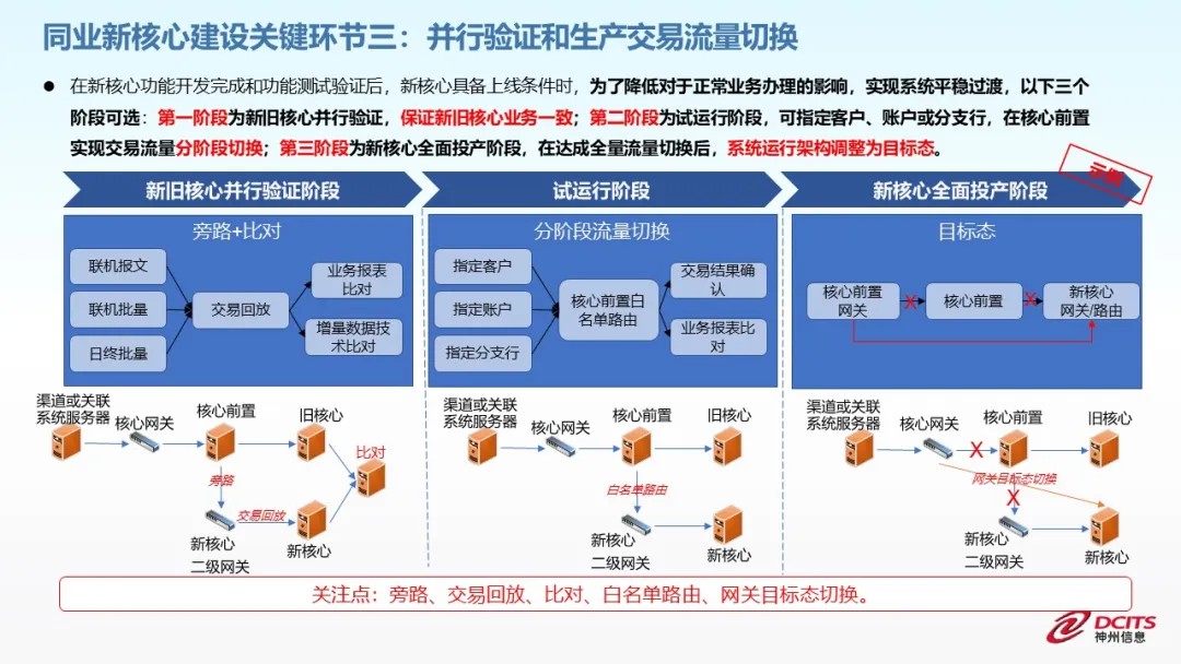 三是核心切換前的并行驗證和生產交易流量切換。在新核心具備上線條件前,為降低對業務影響,實現系統平穩切換,可選擇三個關鍵階段進行上線前驗證: