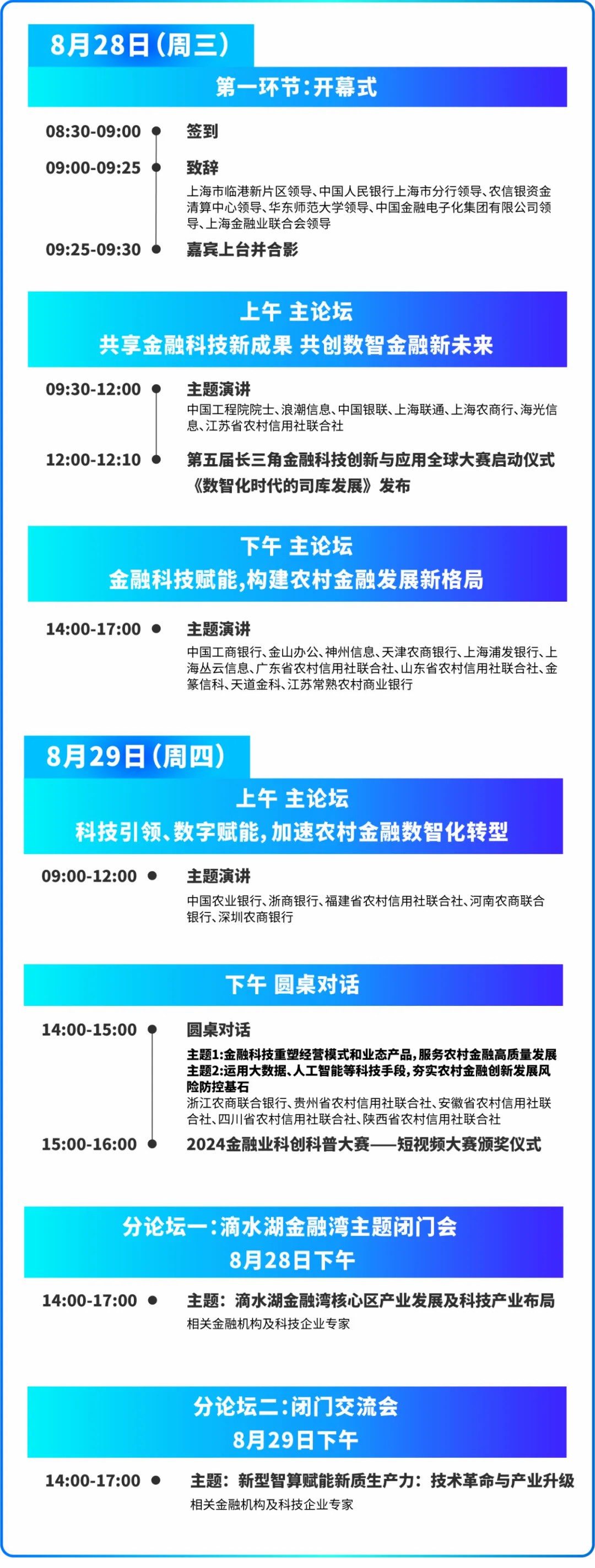 “2024金融科技應用創新發展大會暨第十四屆農村金融機構信息化發展創新座談會”將于2024年8月28日至29日在上海臨港新辰國際會議中心召開。本屆大會以“共享金融科技新成果,共創數智金融新未來”為主題,旨在進一步促進“科技+金融”賦能新質生產力,深入探討金融科技領域最新趨勢、創新應用和可持續發展路徑,加快數字技術對金融業務的全面應用,促進傳統金融向數字化金融發展。