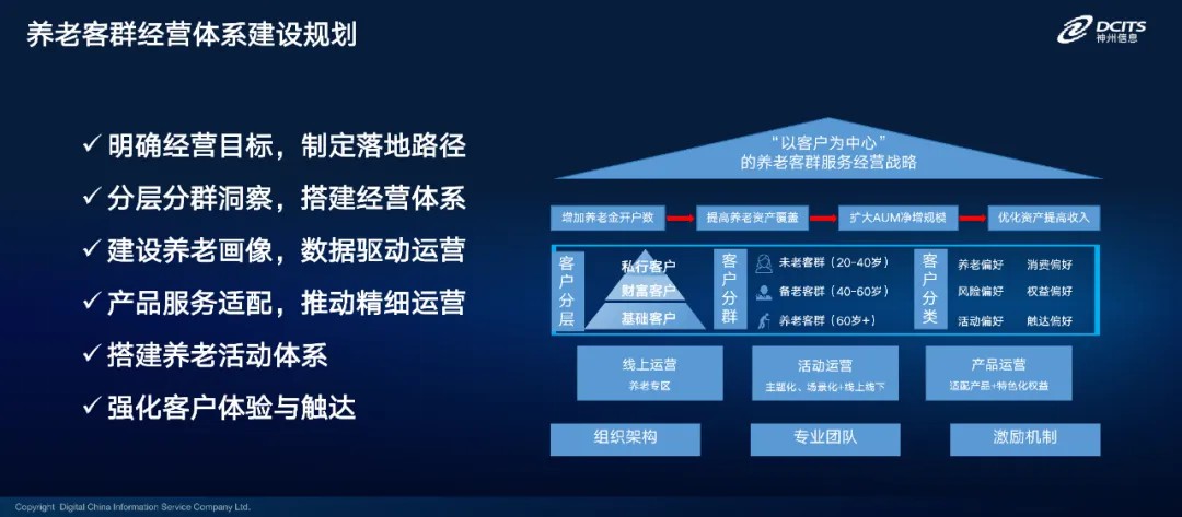 神州信息聚焦養老金融生態的建設和養老客群的深耕運營,提供“養老客群經營體系規劃+養老金融平臺建設+養老客群陪跑運營”服務,為銀行解決運營活動體系缺失、產品矩陣優勢不明顯、價值客戶轉化效能不足、渠道協同較弱等在養老金融生態建設中普遍存在的問題。