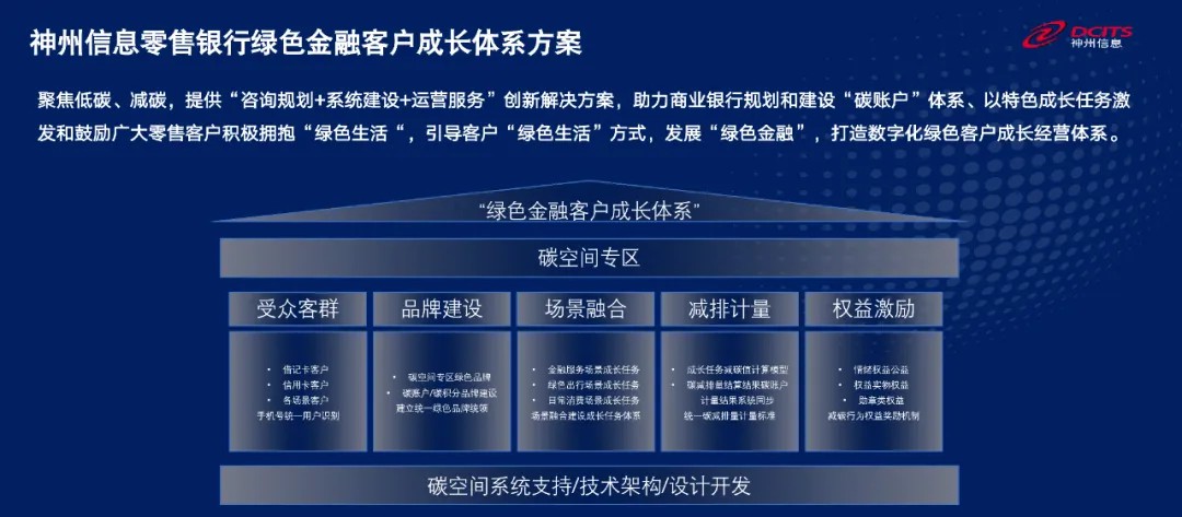 在“雙碳”目標和國家相關引導政策的指引下,神州信息綠色金融創新解決方案,聚焦低碳、減碳,提供“咨詢規劃+系統建設+運營服務”創新解決方案,助力商業銀行規劃和建設“碳賬戶”體系、以特色金融服務激發和鼓勵廣大零售客戶積極擁抱“綠色生活”。