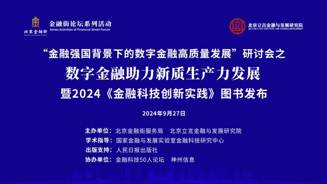 2024年9月27日,“金融強國背景下的數字金融高質量發展”研討會之“數字金融助力新質生產力發展暨2024《金融科技創新實踐》圖書發布”在北京金融街i客廳成功舉辦。本次活動是在國家金融與發展實驗室金融科技研究中心學術指導下,人民日報出版社出版支持,北京金融街服務局與北京立言金融與發展研究院聯合主辦,金融科技50人論壇、神州信息協辦。