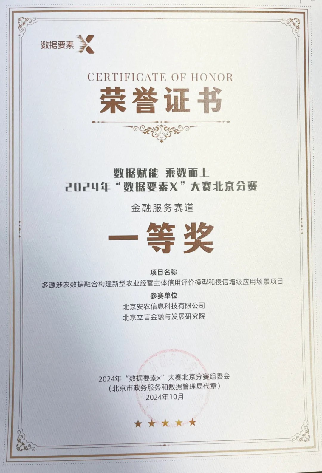 安農信科團隊此前在“數據要素×”北京分賽區獲金融服務賽道一等獎