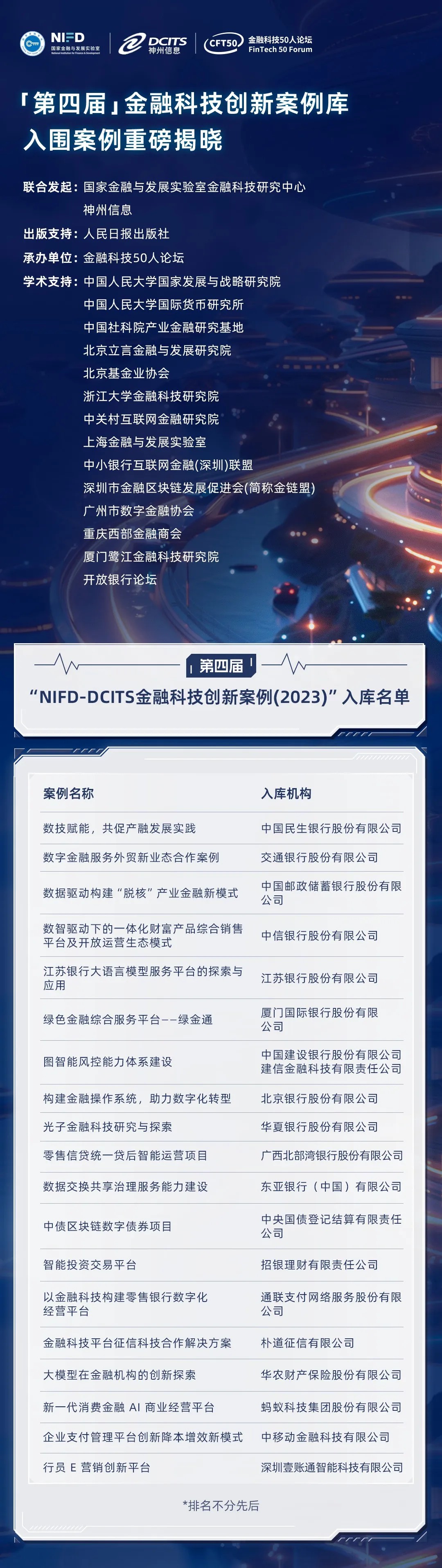 本屆入庫的19個案例,收錄于《數(shù)字金融+新質(zhì)生產(chǎn)力:金融科技創(chuàng)新實踐》一書中,已由人民日報出版社發(fā)行。我們真誠地向為本書順利出版提供過指導(dǎo)與幫助的專家和機構(gòu)致謝,未來期待更多的金融科技生態(tài)伙伴參與到案例編寫工作中。“NIFD-DCITS全球金融科技創(chuàng)新案例庫”旨在建設(shè)成為國內(nèi)外頂尖的金融科技創(chuàng)新案例聚合基地,不僅為政府、監(jiān)管、金融機構(gòu)和企業(yè)提供重要參考素材,還將為國內(nèi)外院校的教學(xué)、研究提供鮮活資料,有效服務(wù)于我國金融科技的健康發(fā)展,并且向國際社會充分展示我國優(yōu)秀金融科技企業(yè)的風貌。